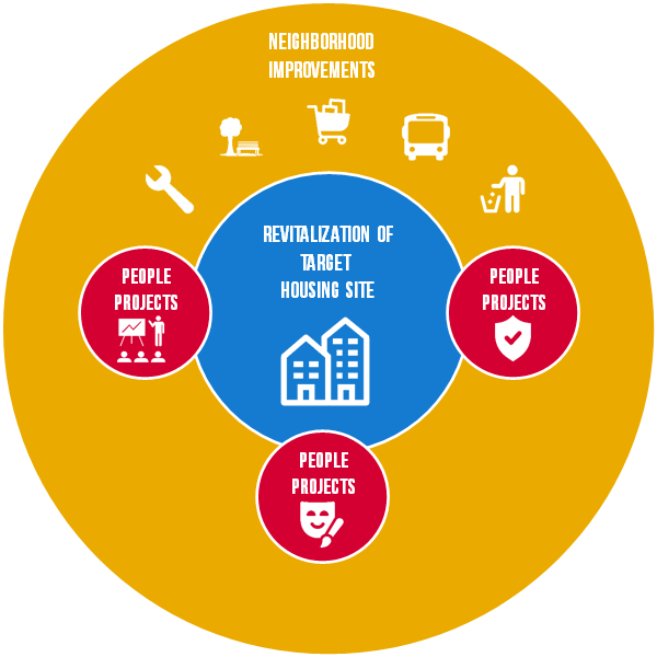 Neighborhood: Transform distressed neighborhoods into viable, mixed-income neighborhoods with access to well-functioning services, high quality public schools and education programs, high quality early learning programs and services, public assets, public transportation, and improved access to jobs.